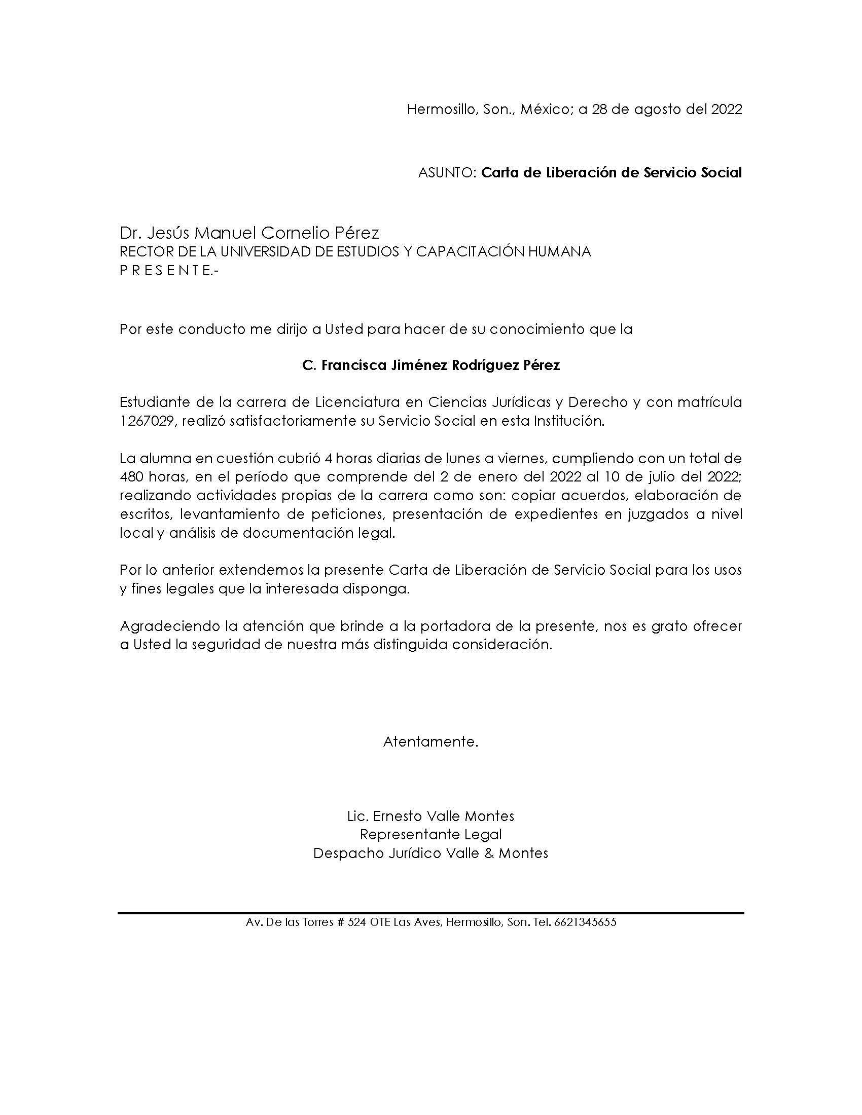 EJEMPLO DE CARTA DE SERVICIO SOCIAL